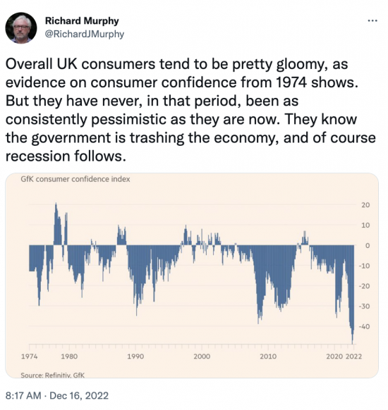 Consumer confidence in the UK continues to accurately reflect the fact that the government is doing its utmost to trash the economy by refusing adequate pay increases, creating industrial conflict and by choosing to let the Bank of England impose wholly unnecessary increases in interest rates that increase the price of money when escalating prices are meant to be the problem that they are tackling.