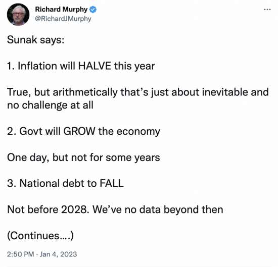 Just start with the big lie, eh? As you have previously and logically said, Richard, inflation will inevitably fall over the coming year as the effect of the exogenous shocks caused by the Russian invasion of Ukraine work their way through the economy. But Sunak wants to take credit for it – “we will halve inflation” – no you won’t pal, it will happen, but not as a result of anything you or your miserable government do.