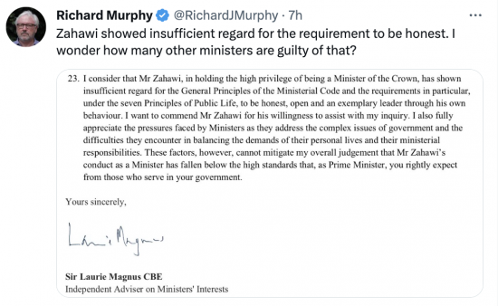 I have just listened to a Conservative MP on C4 News claiming that Sunak did the right thing in going through the Ethics Advisor to remove Zahawi, rather than using his unquestioned PM prerogative, and removing him at will; because the PM was following sound employment law. I fell off my chair.