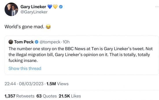 It is the last sentence of the second tweet that put him in the news. It is a sentiment with which I agree, unsurprisingly, because it is true. In my opinion, as a factual observation it cannot be faulted. It is obvious that Gary Lineker thinks so as well. He is very obviously unrepentant.