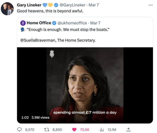 They forget that Lineker was actually engaged by the BBC to talk about the abuse of human rights in Qatar in place of the opening ceremony of the World Cup not many months ago. All that is different now is that he is talking about the egregious abuse of human rights here as well.