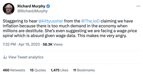 What she claimed was that because the UK labour market is overheated (which it is not: just ask young people looking for career opportunities) and there is still excess demand in the economy (no doubt true amongst her well-paid friends, but not for the vast majority), we must still crack down on inflation.