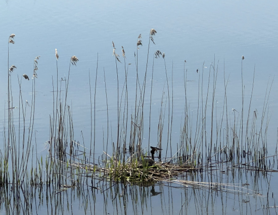 A great crested grebe on its floating nest. Its partner was nearby, standing guard.