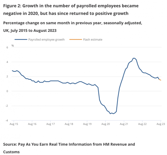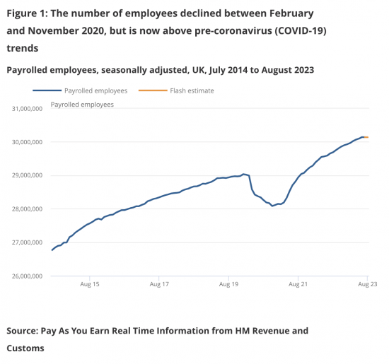 Early estimates for August 2023 indicate that the number of payrolled employees rose by 1.5% compared with August 2022, a rise of 449,000 employees; the number of payrolled employees was up by 3.9% since February 2020, a rise of 1,120,000.