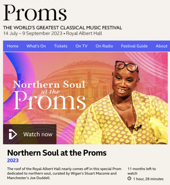 Good to hear that you really liked the Northern Soul Prom, Richard. It was magnificent – and I say that as someone who spent several years (1974 – 1977) making the journey up to Wigan Casino from Burton on Trent on a Friday or Saturday night, by coach (with many other ‘soulies’ from the Burton area), or with four of us crammed in my 850 Mini). Stuart Maconie deserves all the praise and credit he’s had for getting the event together, and the singers and BBC orchestra for their rendition of so many Casino classics. It was hard to tell many of them from the originals.