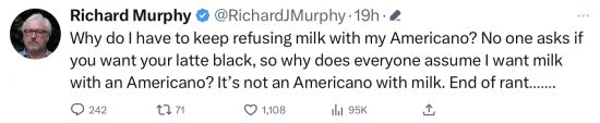 I think you’re right to grumble about the milk question. If one asks just for an Americano it should default to arriving without milk. But this is with the proviso that others should be free to embellish it however they want. I ask explicitly for ‘Americano with Milk’ as this variant is my preference, and I’m grateful for not having to drink filter coffee or any of the other too-milk-heavy options.
