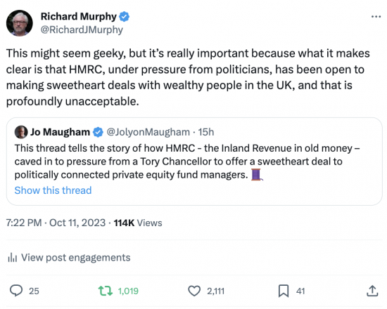 I wrote this Tweet last night after a conversation with Jo Maugham, the tax KC who is the director of the Good Law Project who wrote the Tweet I was promoting: