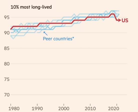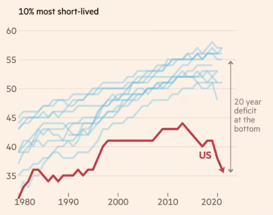 For the bottom ten per cent in the US, life expectancy is about 20 years less than in most other equivalent n countries at just 36 years.