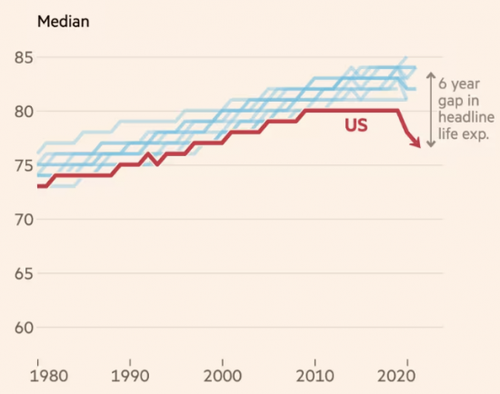 John Burn-Murdoch has another of his quite amazing statistical analyses in the FT this morning. In this one, he compares US life expectancy of various groups in society with that of similar groups in other broadly similar societies.