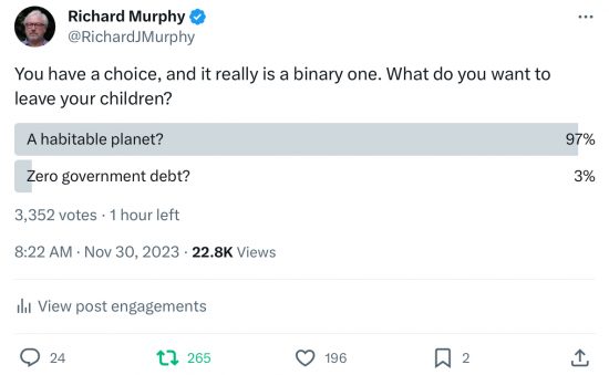 There is no way that we are going to save the planet for human habitation without greater government investment. That is, in turn, going to require the reorientation of savings away from private sector deposit takers and towards government based savings mechanisms that will provide the capital to make this process possible. Anyone can pretend otherwise, but I just don't see how we can do it in any other way.