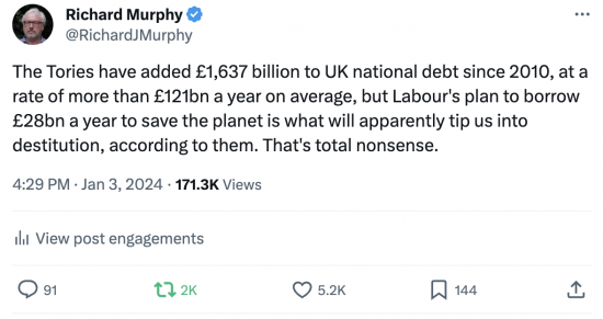 By the way, talking of climate, in my area after storm Henk, the flooding is the worst I’ve ever seen. It’s a good job Sunak’s committed to net zero then, and not in the pocket of the fossil fuel industry and all those lovely dividends he and his wife get from them.