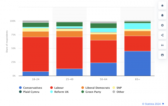 Third, there is a political dimension to this. We know that the wealthy tend to be older. So too are Tory voters. As Statista has reported, voting intentions in a general election in the United Kingdom in September 2023, by age group, were as follows: