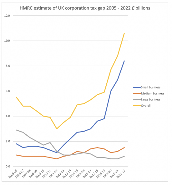 Small company non-payment of tax is now the issue in the UK corporate tax arena. HM Revenue & Customs do, I think, still seriously underestimate this tax gap and its ramifications by suggesting that it might be £8.4 billion a year. The large business tax gap is, in their estimate, just ten per cent of that.