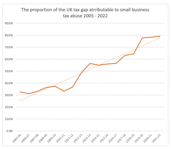 The chart does, in itself, prove why. The small business tax gap has gone through the roof. As a proportion of the total UK corporate tax gap it has changed like this: