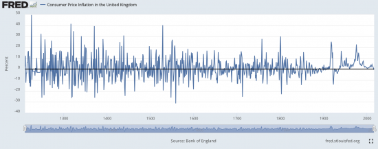 This chart, produced by an American central bank called the St. Louis Fed - which always produces amazing economic statistics for those who want to look at such things - is actually a reproduction of research undertaken by the Bank of England, which shows the inflation figures in the UK since before 1200. I don't mean before midday. I mean literally from 1200, 800 years ago.