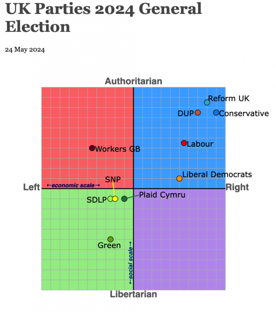 This analysis from the Political Compass website on where the UK's leading political parties might be on their electoral map is interesting: