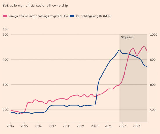 I also note the chart says foreign official sector gilt holdings, so that means foreign central banks. Quite possibly the 45 central banks that have reserve accounts at the BoE. I would have a look at their reserve balances. They can swap those into gilts at the current low prices, then get repaid down the road with a nice profit as a gift from HMT. Is subsidising foreign states now official BoE policy?