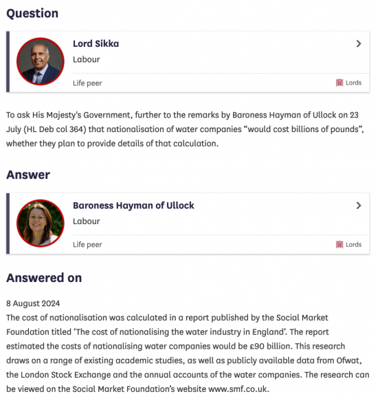 Many thanks for the link, it appears Baroness Heyman of Bullocks is relying on a report that is over 5 years old and takes no account of the changing circumstances or depreciation in assets or funding in the water industry. Given this industry affects every single person in the country our non elected spokesperson could not even take the time or effort to review the information but has chosen to ‘Cut and Paste’ her reply from part of the right wing organisations report. Have these people no shame in exposing their own lack of ignorance or work ethics.