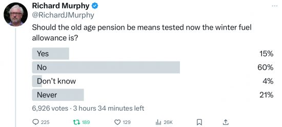 I put up a Twitter poll yesterday, asking whether the state pension should be means tested. After 20 hours this was the result: