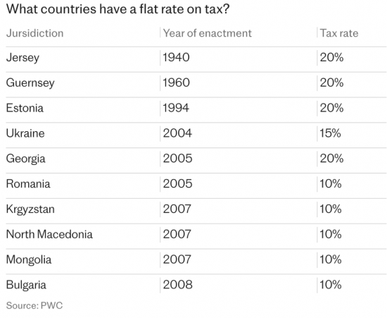 Right at the top of the list are Jersey and Guernsey, in the Channel Islands, which are part of Great Britain but which are not part of the United Kingdom. And they have had a flat tax since 1940.
