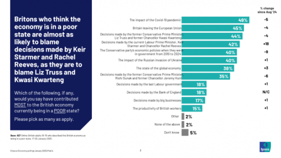 Blame game: Those who view the economy negatively are almost equally as likely to blame decisions made by the current Labour government under Keir Starmer and Rachel Reeves (42%) as they are to blame the previous Conservative government of Liz Truss and Kwasi Kwarteng (44%). There has been an 18 ppt increase in those citing the decisions made by the current Labour government since August 2024. The impact of the Covid-19 pandemic (49%) still receives the most blame, while Brexit (45%), the Conservative party's economic policies overall since 2010 (40%), the war in Ukraine (40%) and the state of the global economy (38%) are also cited as major contributing factors in the country's economic state.