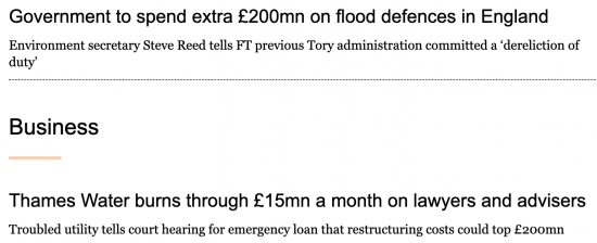 The FT headline ref Thames is incorrect: “Thames water burns through £15m/month of money paid by people that “enjoy” its services – on lawyers, advisers and similar parasites to defend itself against providing a shit service to the self same people aka Uk serfs”.