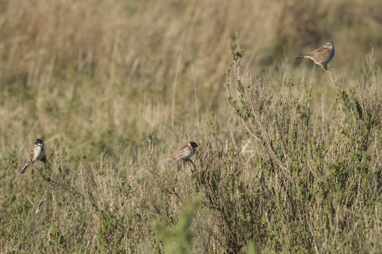 That is rwo reed buntings and a dunnock, enjoying the sun.