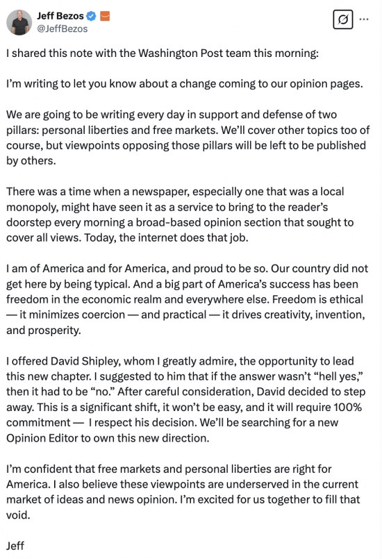 Staggeringly, Bezos is proud of the fact that he is withdrawing from impartiality and that his paper will no longer seek to offer alternative views. His claim is that the web provides the alternative view. The disparity of resources between his organisation and those challenging his opinion must be known to him, but again, he does not care.