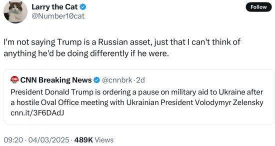 I agree with Larry the Cat to the extent that he is right to say that there is nothing more Trump could do to suggest he is a Russian asset.