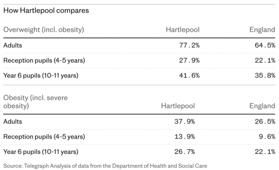 - As is apparent, as a poor area, Hartlepool has a massive obesity problem, but so too does the UK as a whole. Poor mental health might well be fuelled by excessive sugar in diets, creating the inability to engage in school. Prioritise wholefoods throughout education, as Japan does, and obesity will tumble, and I strongly suspect mental ill health will as well, whilst attainment rates will rise.