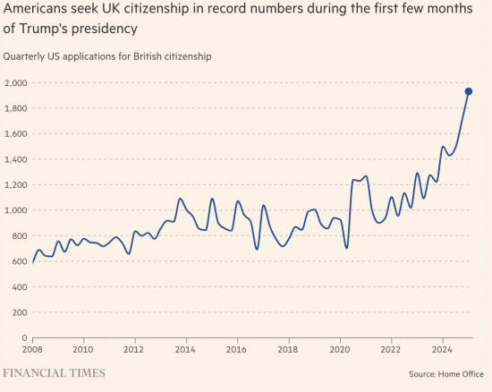But I really want to look at this through another lens, which is small as yet, but which I suspect will grow. This is data on US applications for UK citizenship: