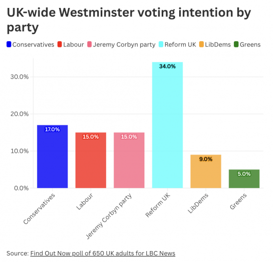 But look, who else they are going to vote for. 15% said they might vote for Jeremy Corbyn's new party, which doesn't even exist as yet, and 34% said they'd vote for Reform, a party that has already lost two of the five MPs that it had elected last July, and is in chaos in the councils that it runs, and cannot frankly organise the proverbial in a brewery.