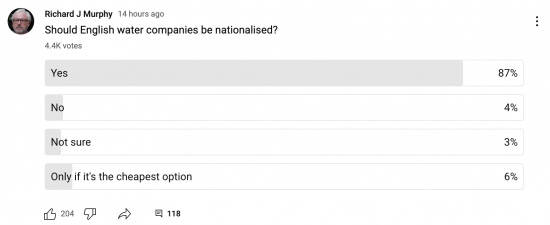 I know that polls here and on my YouTube channel are not statistically valid. The sample is bound to be biased, but last night I posed the same questions on both sites in response to a video on the nationalisation of water.