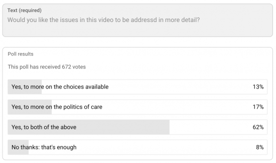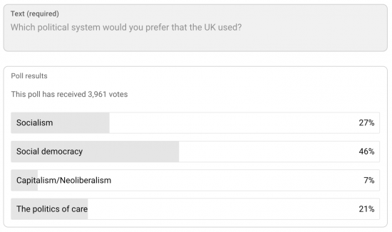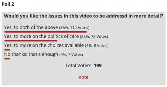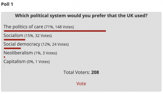 Did the video viewers all watch until the end? Your proposal for a politics of care came last – I wonder if viewer inattention or not actually watching it all could account for the lower vote for Politics of Care? The latter has commonalities with social democracy but with less emphasis on the material side of life and more on well-being. Maybe reading a blog article lends itself to more thoughtful consideration and reflection about concepts like this, compared with the relatively lower attention-span requirement for watching a video. Hence the vote distribution more favourable to your argument for a Politics of Care amongst blog readers.