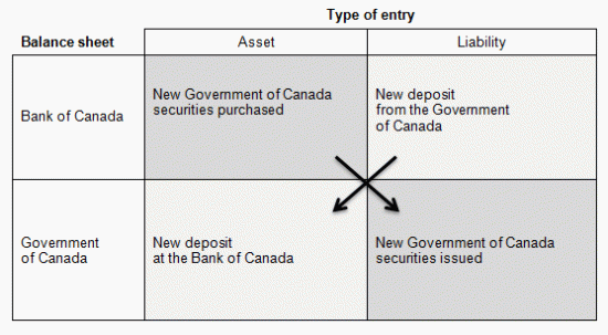 Since the Bank of Canada is a Crown corporation wholly owned by the federal government, the Bank's purchase of newly issued securities from the federal government can be considered an internal transaction. By recording new and equal amounts on the asset and liability sides of its balance sheet, the Bank of Canada creates money through a few keystrokes. The federal government can spend the newly created bank deposits in the Canadian economy if it wishes.