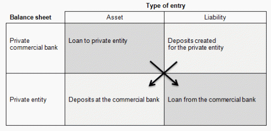 This chart illustrates the impact on the balance sheets of a private commercial bank and a private entity when the bank provides a new loan to the private entity.