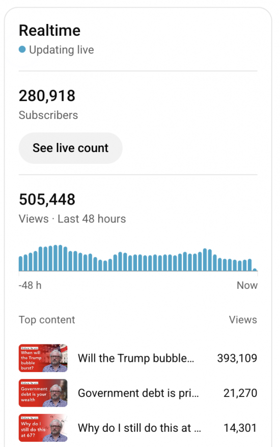 Still, we'll take half a million views in 48 hours. The total traffic on that one video is now 493,000. We have done better, having had several with one million views, but this is the best since April, and such things are pleasing. We produce a lot of what might be described as good album tracks, but the odd hit along the way never does any harm.
