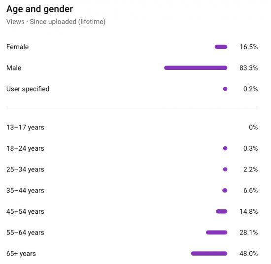 Meanwhile, and even more than usual, our audience is older, and heavily male: