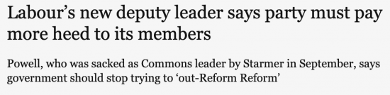 However, the news is that Starmer has no intention of giving Lucy Powell a job back in the Cabinet. She might be deputy leader of the party - which made Angela Rayner deputy prime minister - but Powell is to be left on the back benches in an act clearly intended to send a defiant signal to those in Labour who oppose what Starmer is trying to do.