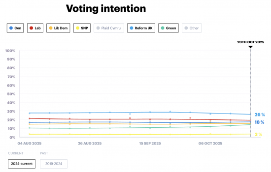 With 4 years to go before the next election, LINO are maybe hoping that something will turn up and things will change in their favour over that period: some magic will ensure they go up in the polls, the others go down, and they will eventually win a well-deserved 2nd term (albeit maybe with a reduced majority since they had to make hard choices). But in the absence of a really convincing change of heart and change in direction of travel, that will not happen. Since the Greens have all the momentum and may well increase their share of voting intentions and Your Party may eventually take a few more votes away from LINO, it is possible that LINO could be relegated to 4th or even 5th party status. A prolonged period of that could just change their minds about PR. In that scenario they may decide that hoping to be the biggest party in a non-Reform/Tory coalition is preferably to complete oblivion. Either way, it is clear from ongoing media bias that the Establishment are throwing their lot in with Reform so won’t be overly bothered if LINO goes down having served their purpose of keeping the music playing for the elite for a while.