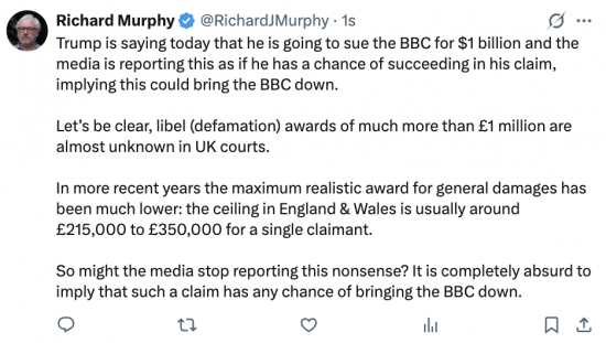 Those discussing impartiality should be pointing out that Trump needs to get some decent legal advice because any claim for $1 billion in damages is going nowhere in the UK, especially as he won the 2024 election and has subsequently massively increased his personal fortune, making it almost impossible to imagine how he could prove he has lost anything even if the BBC did commit errors of judgement. This is the sort of case where £1 damages look likely, even if the claimant wins. He should be warned that this has happened.
