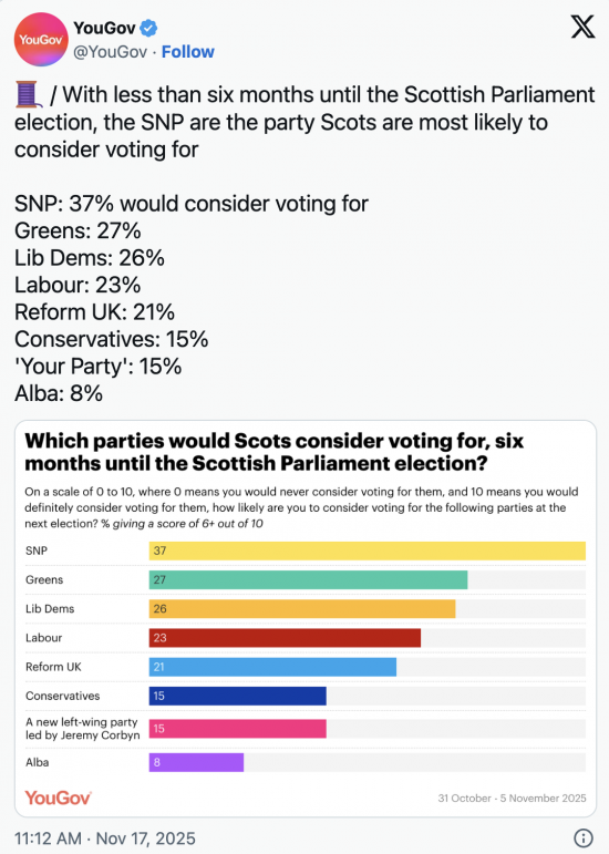 Not long ago, Labour thought it could win in Scotland. YouGov now suggests that they are running fourth in the country: