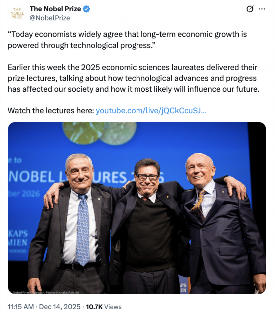 Suggesting “Today economists widely agree that long-term economic growth is powered through technological progress” looks horribly like another dud Nobel prize to me.