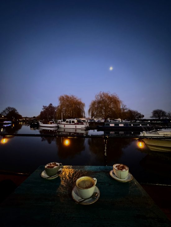 Having posted a flurry of new glossary entries on the blog yesterday afternoon, I accepted an invitation from Jacqueline and James to join them on a walk along the river Great Ouse through Ely, heading north, first of all, before crossing the river, to then turn south, before finally completing a loop. Coffee was then taken by the waterfront sometime after the sun had set, to the bemusement of the staff who served us, who could not understand that this far into our several-mile walk, we were amply warm enough to sit outside.