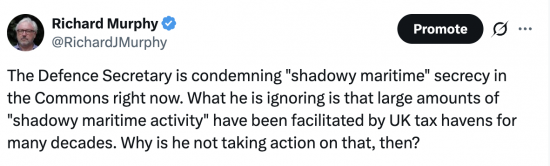 Let me, however, return to the subject of my tweet. It has been well known for decades, and was documented by me in my 2010 book on tax havens, that essentially disposable tax haven companies, enjoying significant levels of opacity as to their operations, ownership and control, are widely used in shipping to limt the information available on the identity of those managing more marginal shipping fleets of vesels used for santion busting and other illict trades. The call for accountability on this issue has been going on for a long time, requiring proper corporate identities with open registers of beneficial ownerships and officers, as well as proper accounts on public record, but although the UK has the power to enforce this requirement in its Overseas Territories and the Crown Dependencies, in none of which are such things properly available, nothing is really happening to effect the required levels of openness.