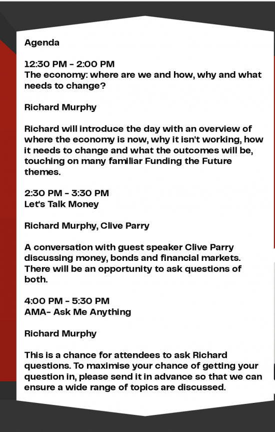 The focus will be very much upon meeting and getting to know people, whilst discussing the state of the economy, the politics of care, technical issues that you want to raise, and whatever else (within reason) that you want to talk about, because more than half the time available will, in effect, be dedicated to question and answer sessions. That is because, based on my experience from previous meetings of this sort that I've done, this is what people want.