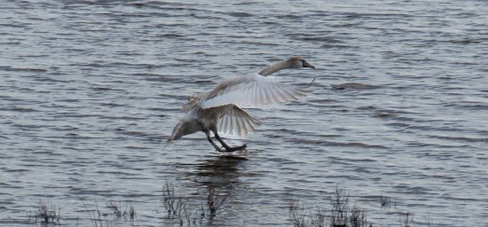 More sedately, there is this Whooper swan cygnet, coming in to land: