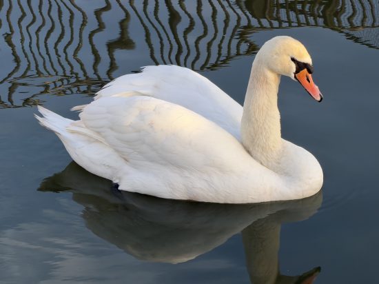 And then, my swan of the day, a mute swan on the Great Ouse. The reflection is of the railings of the bridge above it. I concentrated on them. My regret is that I cut off the reflection of the swan's head. You live and learn when taking photos. There is always next time to try to get it right: